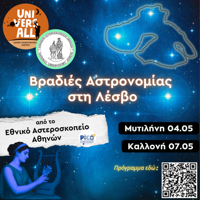 Το Εθνικό Αστεροσκοπείο Αθηνών υλοποιεί φέτος το πρόγραμμα «UniversALL: Αστρονομία για μαθητές και μαθήτριες ακριτικών περιοχών» στην περιφέρεια Βορείου Αιγαίου, στο οποίο συμμετέχουν 35 δημόσια σχολεία της δευτεροβάθμιας εκπαίδευσης από τη Λέσβο, τη Χίο, τη Σάμο, την Ικαρία και τη Λήμνο. Στο πλαίσιο του προγράμματος, έχει προγραμματιστεί επίσκεψη ερευνητών μας στην Λέσβο, με στόχο τη…
